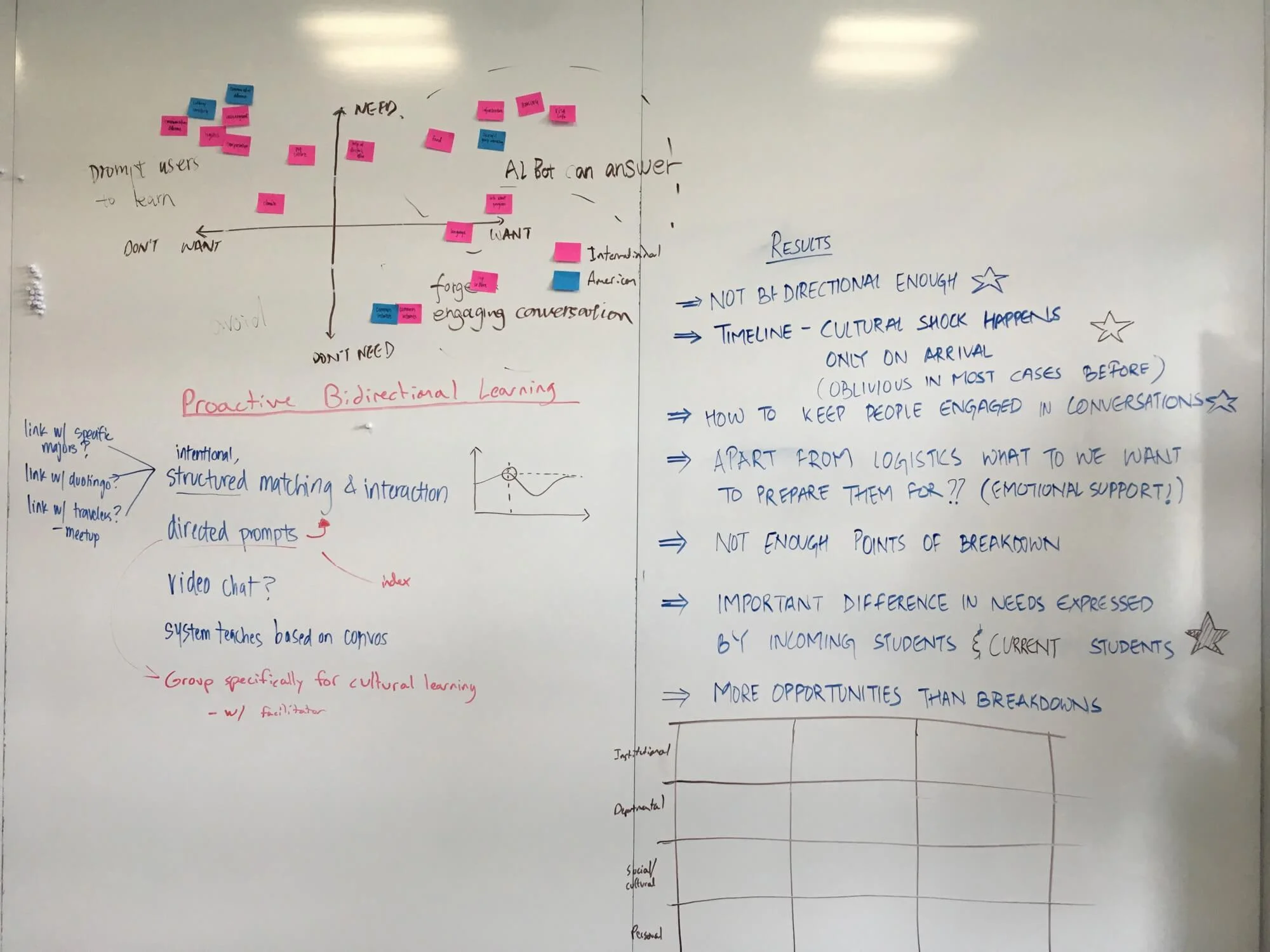 We learned from our research that there is a big dip in emotional state when international students arrive in america and are forced to face all of the difference between their culture and America’s. So we chose to intervene before arrival in hopes of lessening that dip. By helping international students build a network and learn about the cultural differences before arrival, they will hopefully be more prepared and aware.
