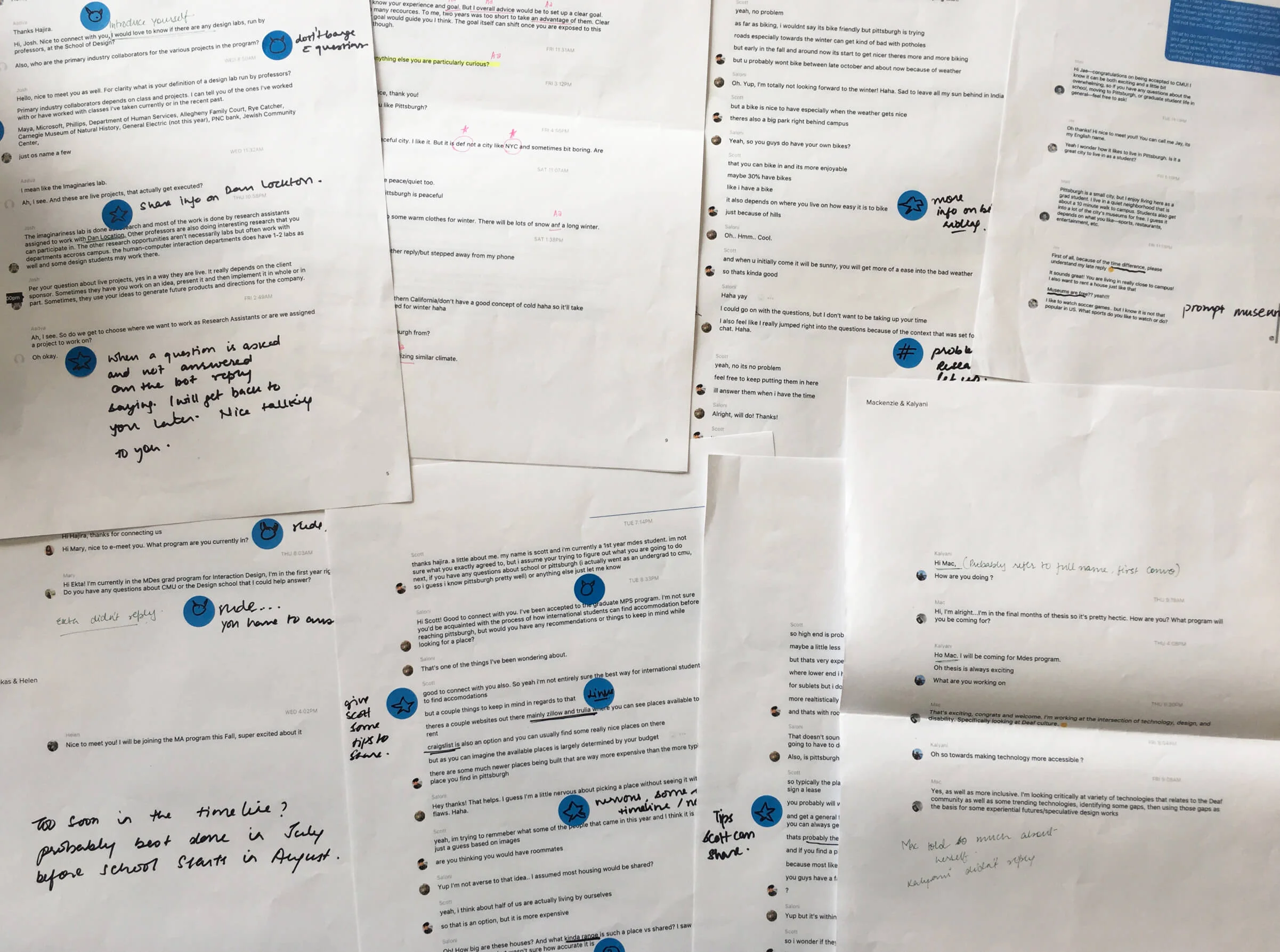 To further evaluate the desirability of our concept, we matched incoming international students with current students and with incoming international students . We encouraged them to engage in a chat using Facebook messenger. After 5 days, we reviewed the conversations to find any patterns of breakdowns and opportunities for intervention.